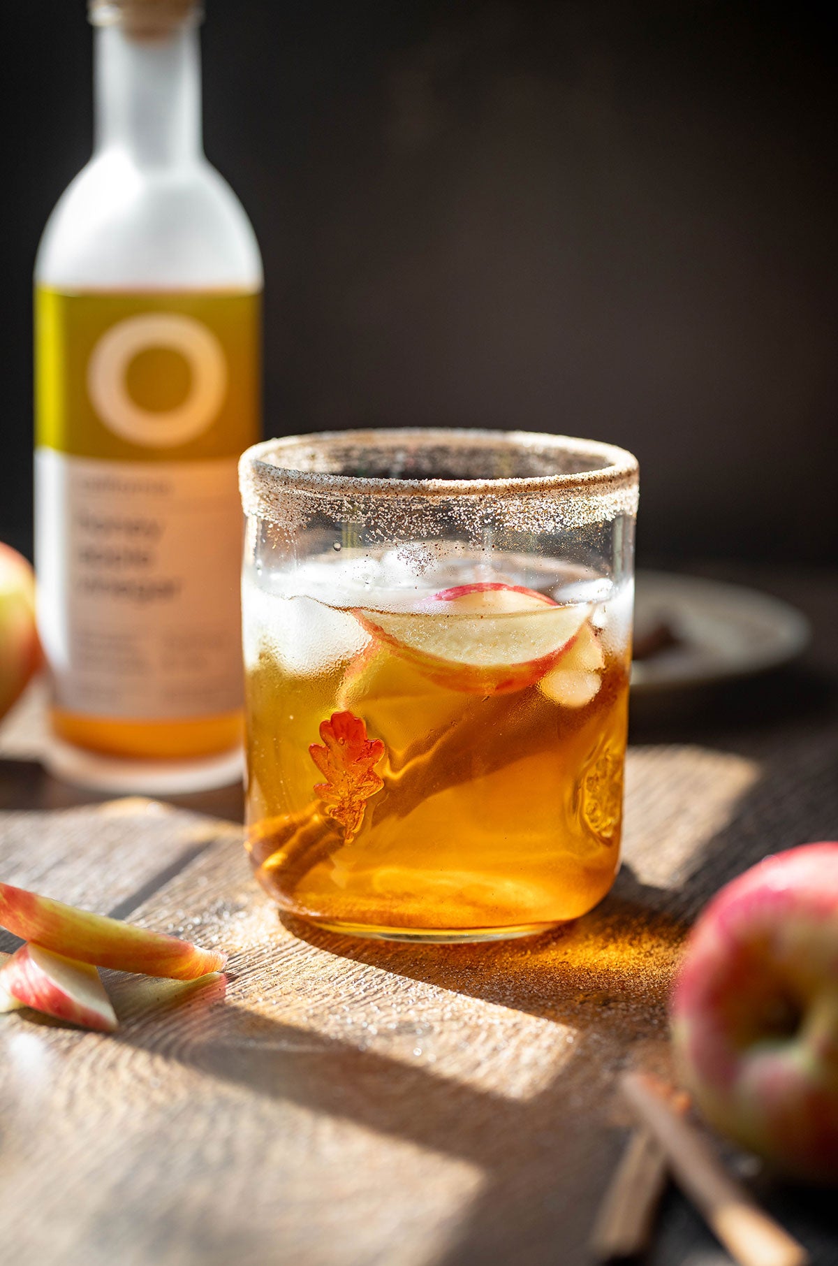 2. Add ice to a shaker. Mix together apple cider, bourbon, O Honey Apple Vinegar, vanilla,