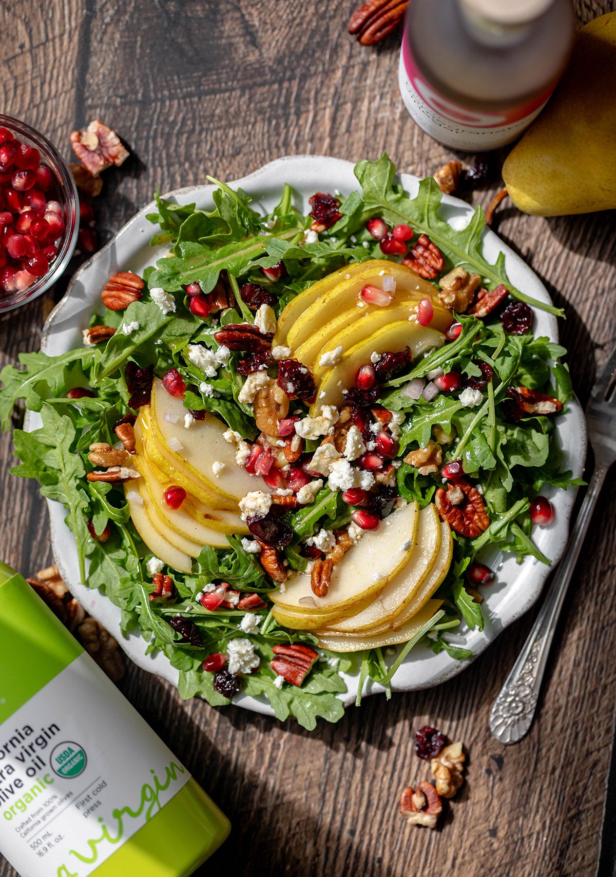 In a large bowl, add the arugula, pears, shallot, chopped nuts, dried cranberries, and pomegranate seeds. Gently toss with the vinaigrette. Top with cheese (optional).