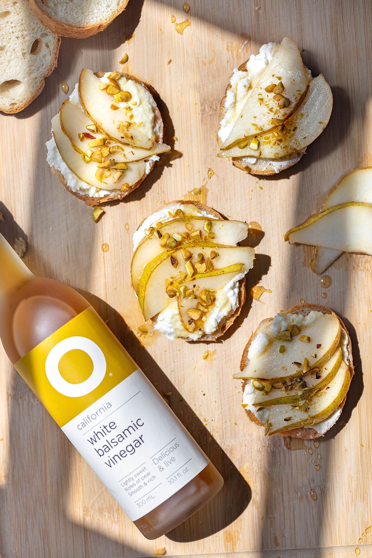3. In a small bowl, add O’s White Balsamic Vinegar and honey, whisk together. Drizzle the vinegar honey mixture over the top of the crostini.