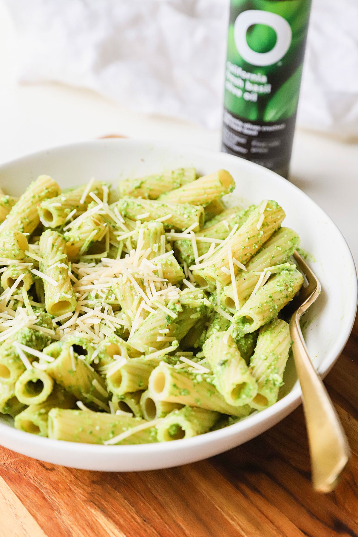 3. Add cooked pasta to a bowl. Drizzle pesto on top and mix.