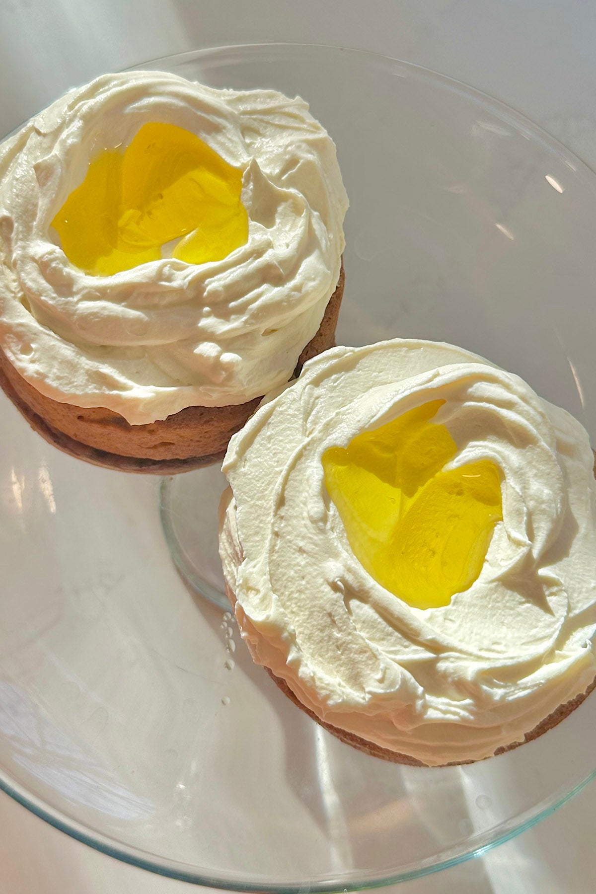 7. Spread a layer of frosting over one cake, top with the second layer, and cover the top (and sides, if you like) with more frosting.