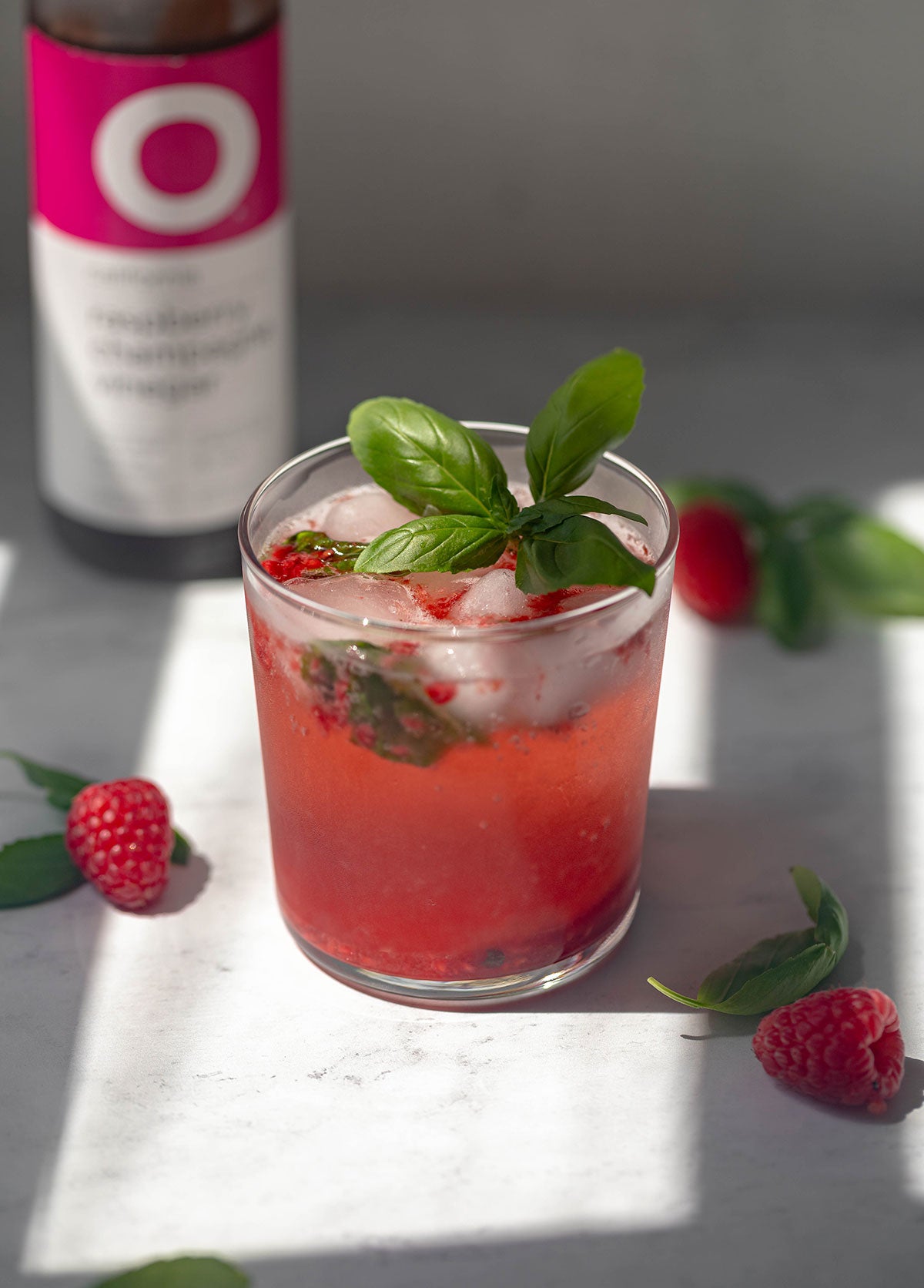 1. Add fresh basil leaves and raspberries to your glass, pour in O’s Raspberry Champagne Vinegar and muddle together.