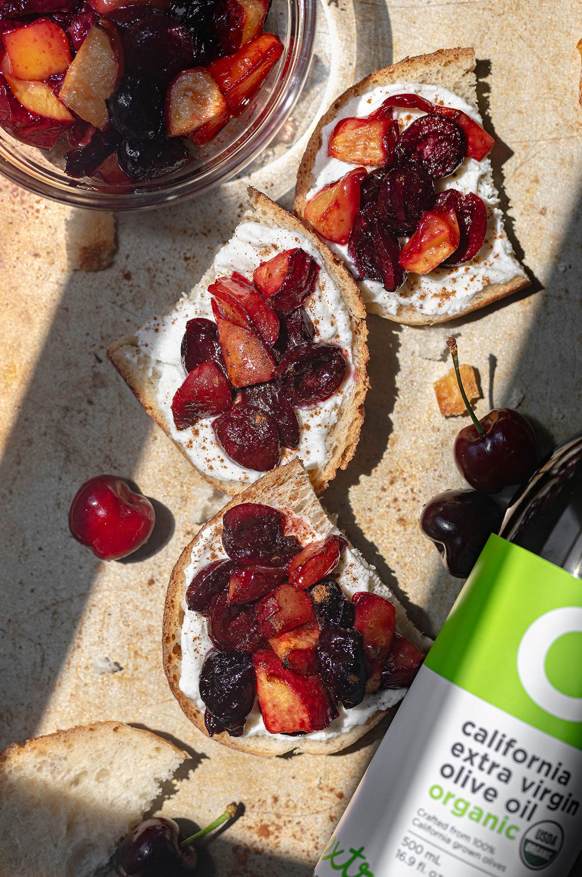 1. ROAST FRUIT: Preheat oven to 400oF and line a baking sheet with foil. Remove the pits from the cherries. Slice the cherries and nectarines and add to a large bowl. Drizzle with olive oil and gently stir to evenly coat the fruit. Add the fruit to the prepared baking sheet. Bake for about 20 minutes or until the fruit is tender.