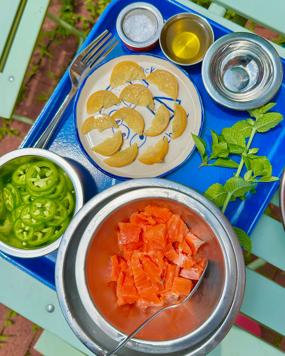 1. Arrange the salmon on a chilled plate or platter in a single layer or slight overlap.