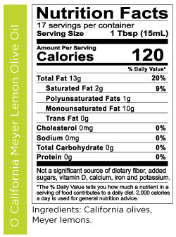 Fresh Meyer lemons crushed with California olives. Family farmed with love. No artificial anything — ever! A difference you can taste.