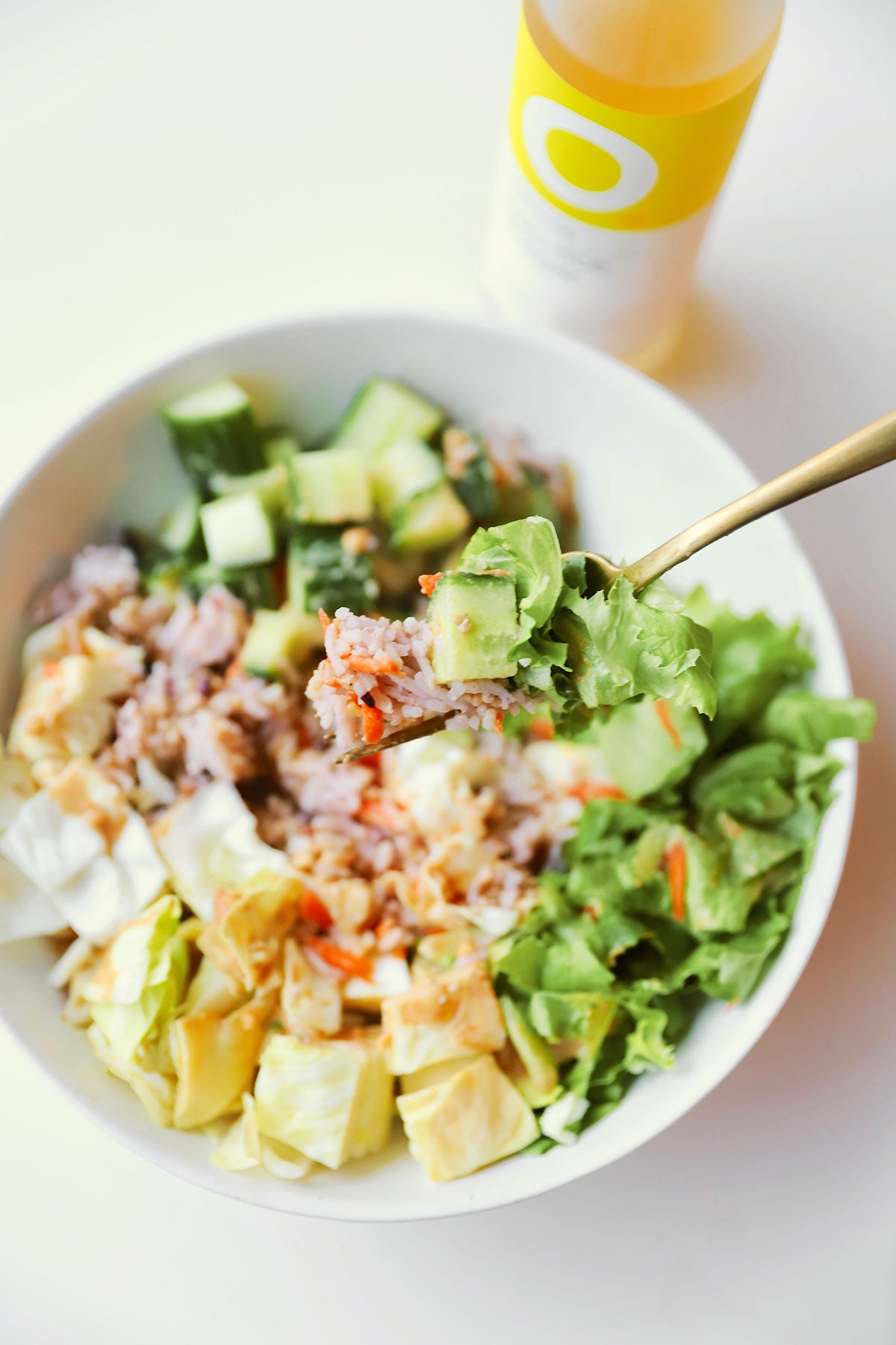 2. Blend salad dressing ingredients together in a small blender. Add more water to thin if needed.