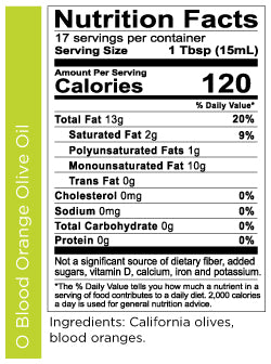 Fresh blood oranges crushed with California olives. Family farmed with love. No artificial anything — ever! A difference you can taste.